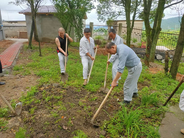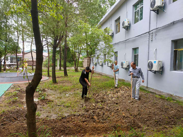今天的任务十分“艰巨”,要将生活区后院改造成菜园。大家热情高涨,自发地分成多个小组垦荒,前面拿铁锹的刚翻完地,后面紧接用锄头镐出田垄,现场一派热火朝天的景象,忙而不乱,秩序井然。