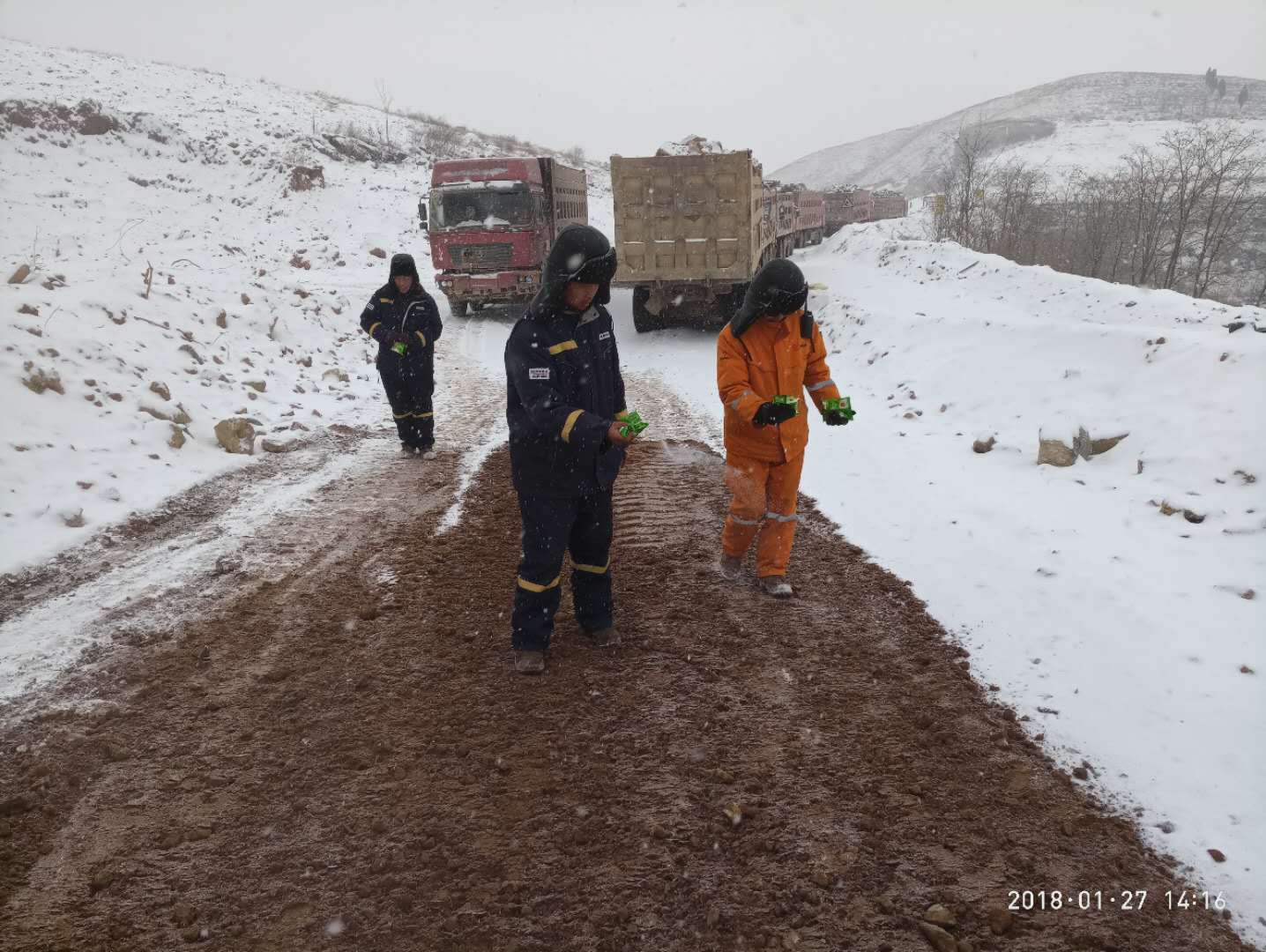 然而,刚刚铺好的“安心”路面很快又被不停飘落的雪花覆盖了、掩埋了,大家又立即采取了人工往运矿道路上撒盐的办法来融雪化冰,以达到安全生产、稳产的目的。