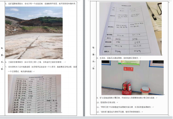 此次检查活动没有检查表,各组人员凭借自己的安全知识和自己岗位安全职责,对矿山现场、生产设备、生产线、生活区、安全设施、形象建设、内业资料等方面进行全面检查,主要目的如下:
