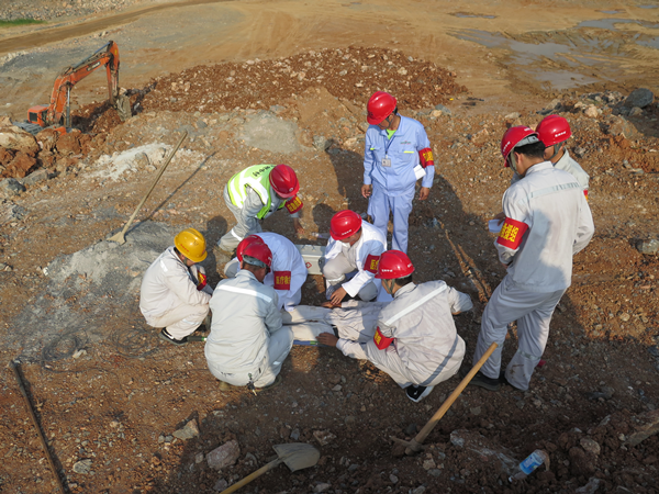 演练模拟矿山施工作业面35平台进行爆破作业,由于炮孔充填深度不够,导致冲孔现象,产生飞石,现场管理人员在矿区北侧警戒时,被爆破飞石砸中,导致部受伤,伤势严重。总指挥在接到救援电话后,立即启动三级应急预案,通知办公室、各应急小组就位。矿山应急救援队员携带专业救援装备,驾驶应急救援车,拉警报,火速赶赴事故现场。到达现场后,立即判断受伤人员伤情,及时救出并进行止血包扎、固定等简单处理后由救援队员用担架抬上120救护车,并送往就近医院救治演练过程中各应急小组各司其职、协同作战、反应迅速,整个演练过程在快速、紧张、有序的氛围中进行,圆满完成了各项预定任务。
