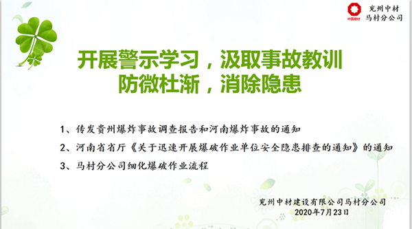 马村分公司于723日下午在会议室举行了“开展警示学习,汲取事故教训,牢筑安全防线”的会议,会议为大家转发了贵州凯里市舟溪镇3.19”较大爆炸事故调查报告》及河南栾川县爆炸事故有关情况、河南省省厅《关于迅速开展爆破作业单位安全隐患排查的通知》。同时为了认真贯彻“安全第一、预防为主”的方针,切实做好现场安全爆破作业,并规范管理使用民用爆炸物品的工作,从根本上消除爆破安全隐患,杜绝爆破事故的发生,实现安全生产,马村分公司参会人员学习爆破作业安全规程的相关知识。