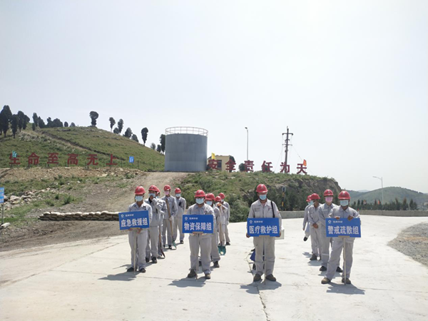 上午10时,演练总指挥孙敏宣布:兖州中材建设有限公司2020年防汛应急演练开始!演练现场指挥刘锋立即启动公司预案应急响应,各演练小组成员按照分工,履职尽责、协调配合,全力展开抢险救援工作。抢险救援组搬运沙袋,构筑防水墙,紧急疏通排水沟,防止山水流入平台,同时启动排水设备,将采坑内积水排出;警戒疏散组紧急疏散现场人员和设备至矿区内东侧安全地带,清点人员和设备,做好警戒疏散工作;物资保障组紧急组织救援物资,确保救援需要;医疗救护组做好了医疗救护准备,一旦发现有人员受伤马上根据伤情进行救治。经过各应急救援小组的协同奋战,演练取得圆满成功。
