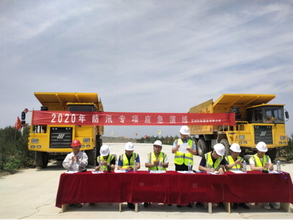 此次演练模拟的情景是:现场人员发现观景平台东侧因大雨导致山水顺坡而下,汇于东侧大水罐交汇处急流于南、北凹陷采场,山水携带的杂物将南侧道路排水沟堵塞,山水汇聚出现险情。