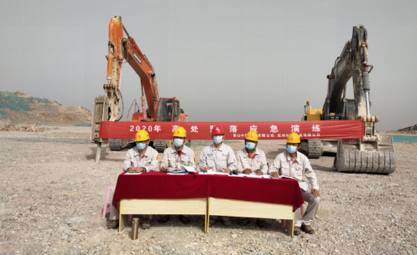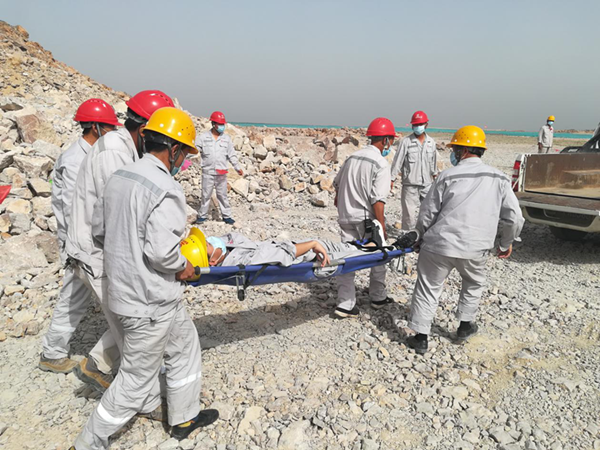 此次演练模拟场景为一名员工从边坡坠落受伤后的紧急处理过程。接到现场巡视人员报告后,项目部立即启动应急响应,随即通知应急救援小组火速赶往事故现场进行救援。警戒疏散组拉起了安全警戒线,封锁事故现场,维持现场秩序;医疗救护组检查伤者情况后,对伤员进行了简单的救治和护理;技术处置组进入高处坠落现场,进行了高处坠落后的安全检查,预防次生事故;物资保障组马上联系了医院,做好了伤员接收的准备。各小组各司其职,演练现场井然有序,最后救护车辆赶到现场,将伤员送往医院,演练活动结束。