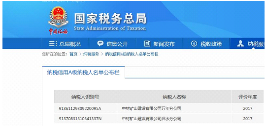 最近,从国家税务总局官网查询到中材矿山建设有限公司万年分公司荣获2017年度“A级纳税信用企业”,这项荣誉称号是国家税务对中材矿山万年分公司在依法纳税等各方面工作的认可,也是万年分公司辛勤努力的结果,同时表明中材矿山万年分公司将会有更多的税收优惠政策和发展机遇,为今后的经营工作和财务工作提供了便利,为公司健康可持续发展奠定了基础。