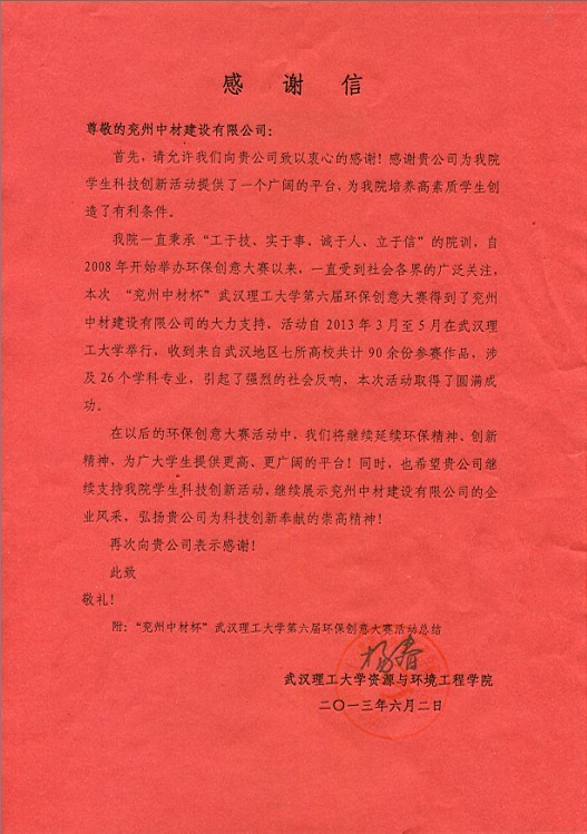 来自武汉理工大学的感谢信