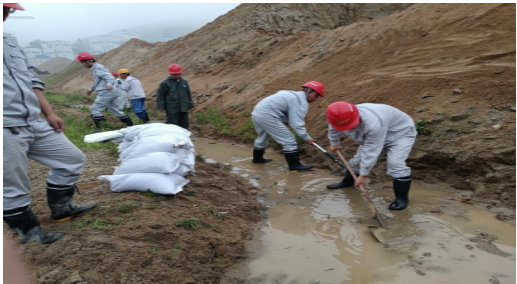 接到通知后,生产科,立即调用装载机赶到现场,组织员工带好防汛装备赶到现场。现场负责人周浩讲“装载机立即清理边坡上的塌陷料,生产科组织人员去上游疏通水道,安全科和设备科组织人员去边坡上面挖掘水沟设置挡墙,避免水流二次破坏边坡”,任务分配完毕后,各科室带领人员紧锣密鼓的组织起来。