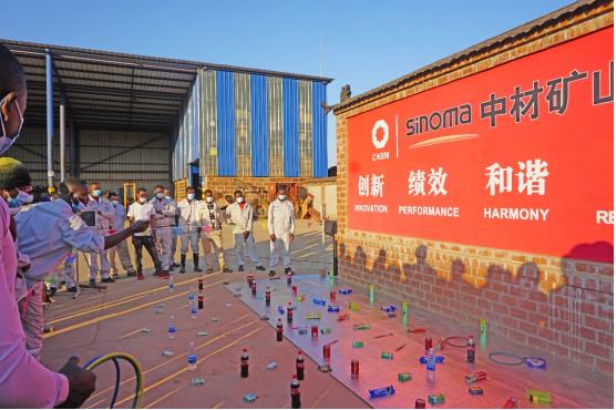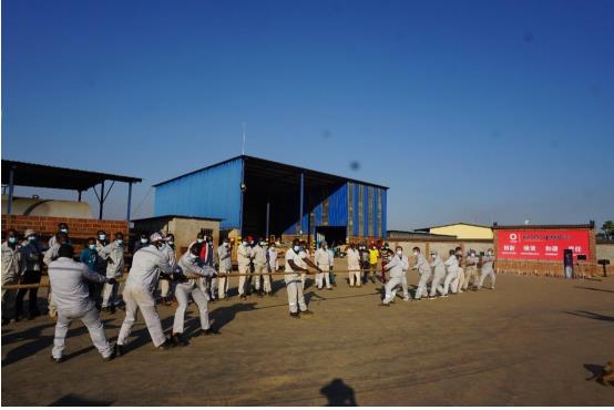举行以各生产部门为团队的拔河比赛,图片为中方员工组成团队与赞方员工比赛图。